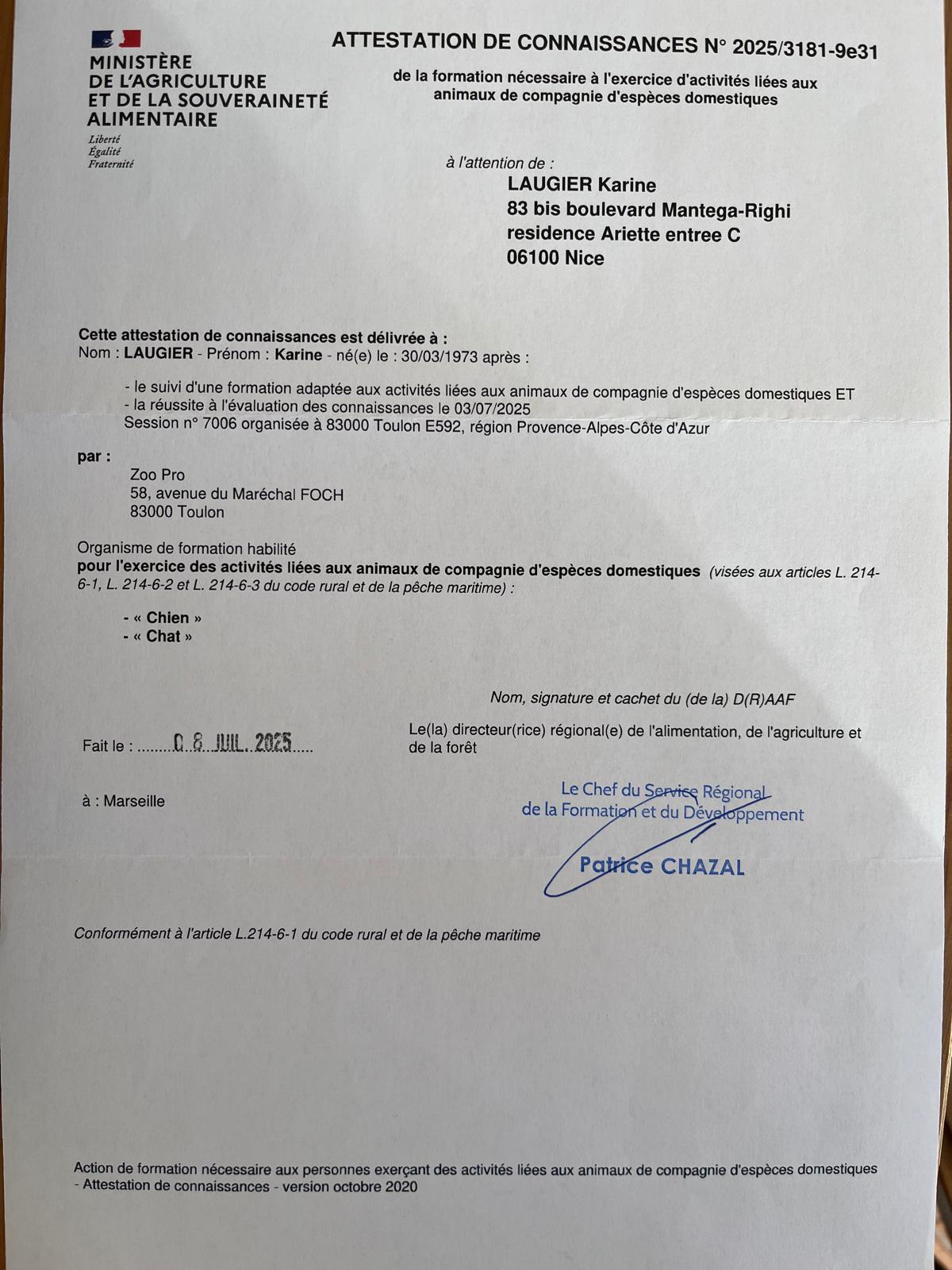Cela me permet de comprendre le tempérament de votre chien, son mode de vie, ses habitudes, ses besoins particuliers, et de voir comment je peux vous aider au mieux.